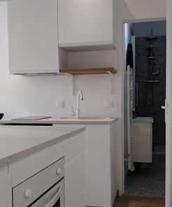 L' ancien espace cuisine (plus que spartiate) est devenu une salle d'eau agréable.